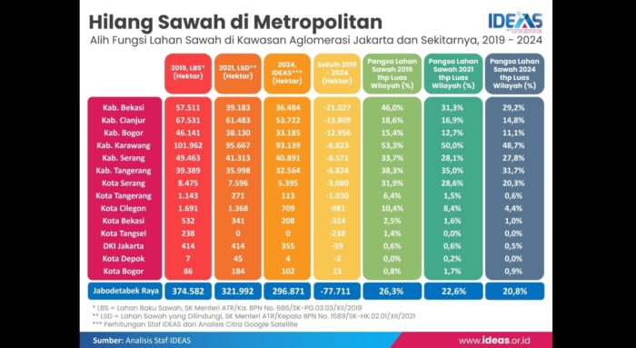 Sri menambahkan bahwa dari dari 77.711 hektare lahan sawah yang lembaganya estimasi telah hilang sepanjang 2019-2024 di kawasan aglomerasi Jakarta, nyaris seluruhnya terjadi di enam kabupaten sentra sawah aglomerasi, yaitu Bekasi (21.027 hektare), Cianjur (13.809 hektare), Bogor (12.956 hektare), Karawang (8.823 hektare), Serang (8.571 hektare), dan Tangerang (6.824 hektare).