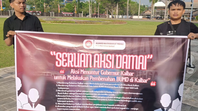 NASIONAL – Puluhan massa yang tergabung dalam aksi damai mendesak Gubernur Kalimantan Barat agar segera melakukan pembenahan menyeluruh terhadap Badan Usaha Milik Daerah (BUMD), terutama Bank Kalbar.
